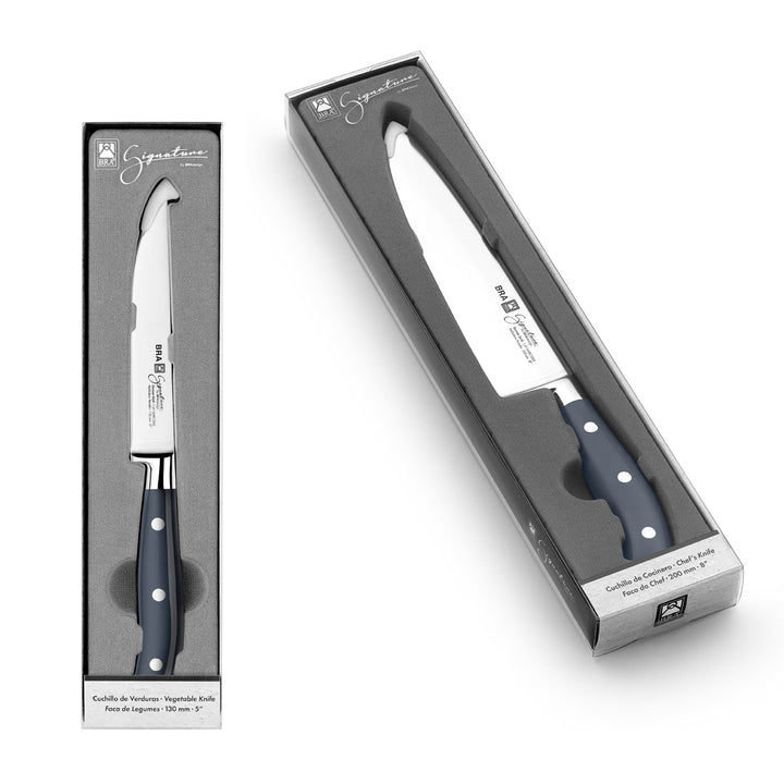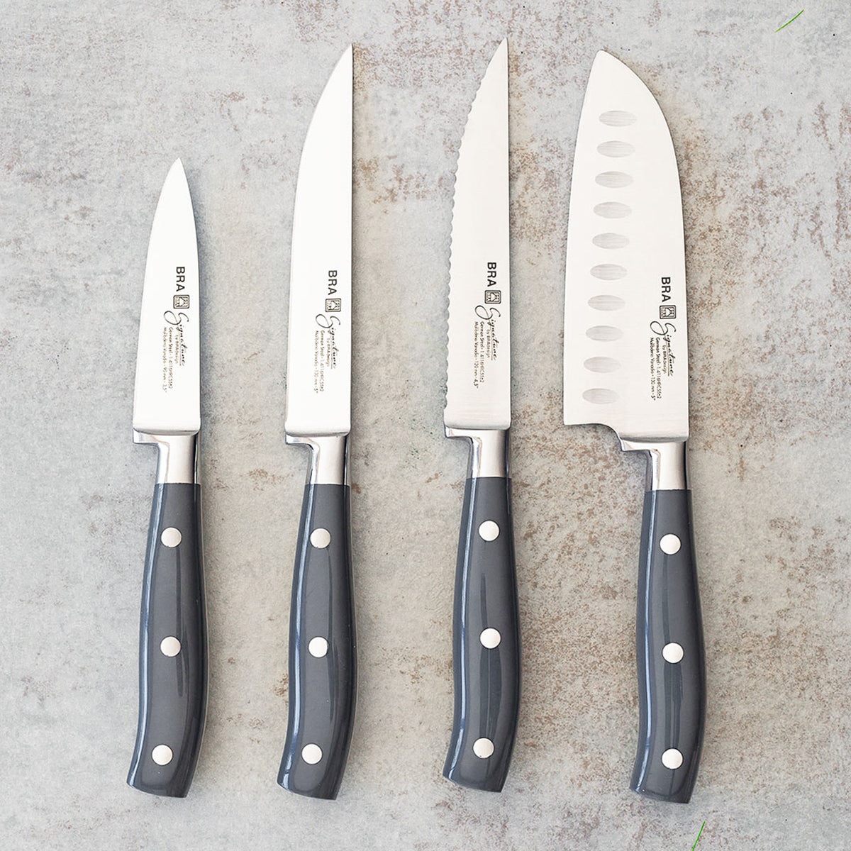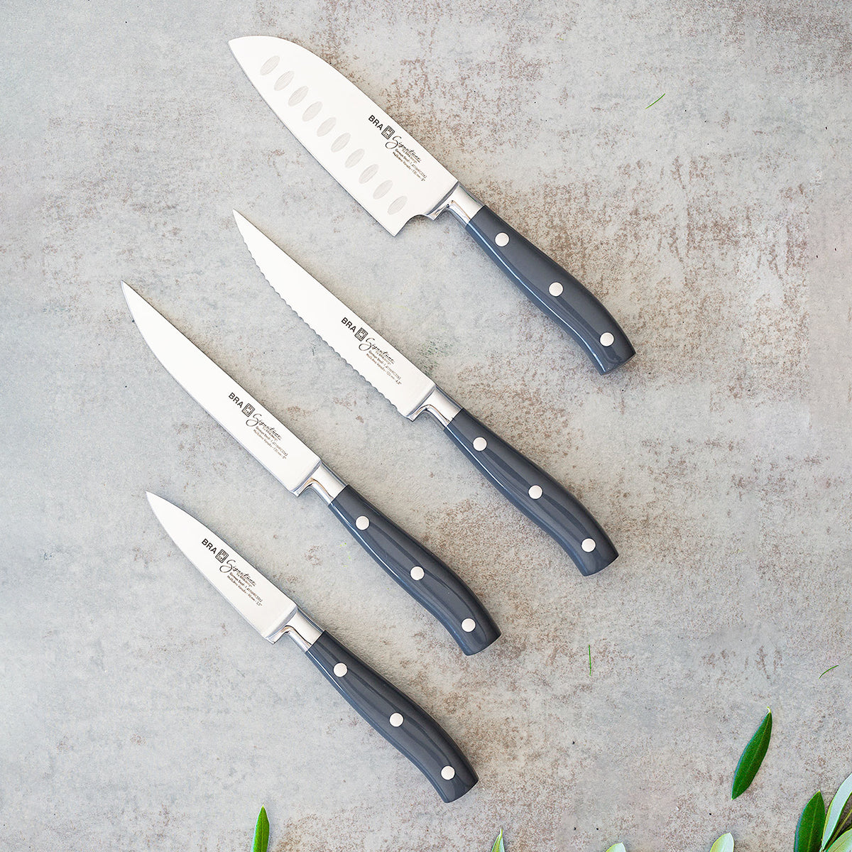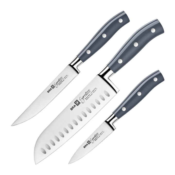 Juego de 3 Cuchillos BRA Signature diseñados para un uso diario con una gran calidad de corte, están fabricados en hoja de Acero Inoxidable Alemán 4116 Krupp Molibdeno Vanadio, de alta calidad, con una virola para la unión de la hoja y el mango, consiguiendo el equilibrado que permite un corte cómodo y seguro. Dureza Rockwell HRC55.
