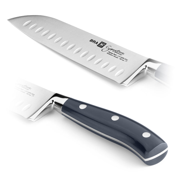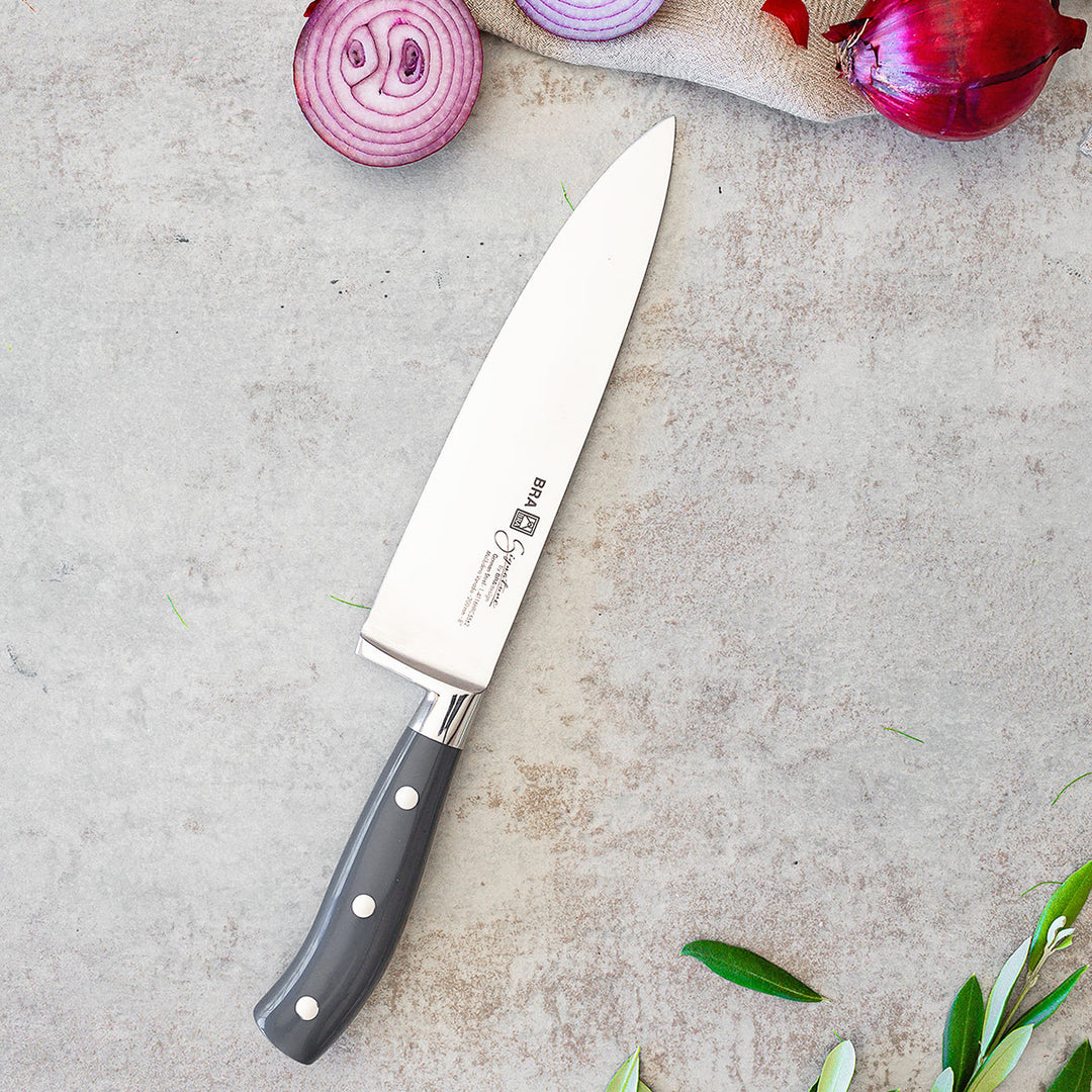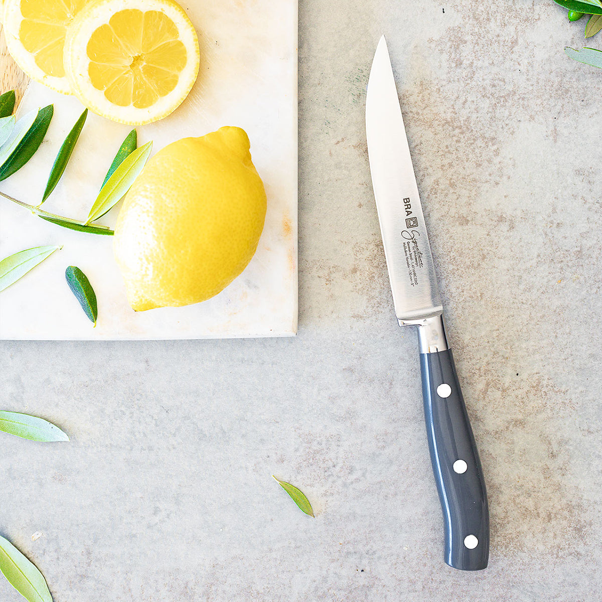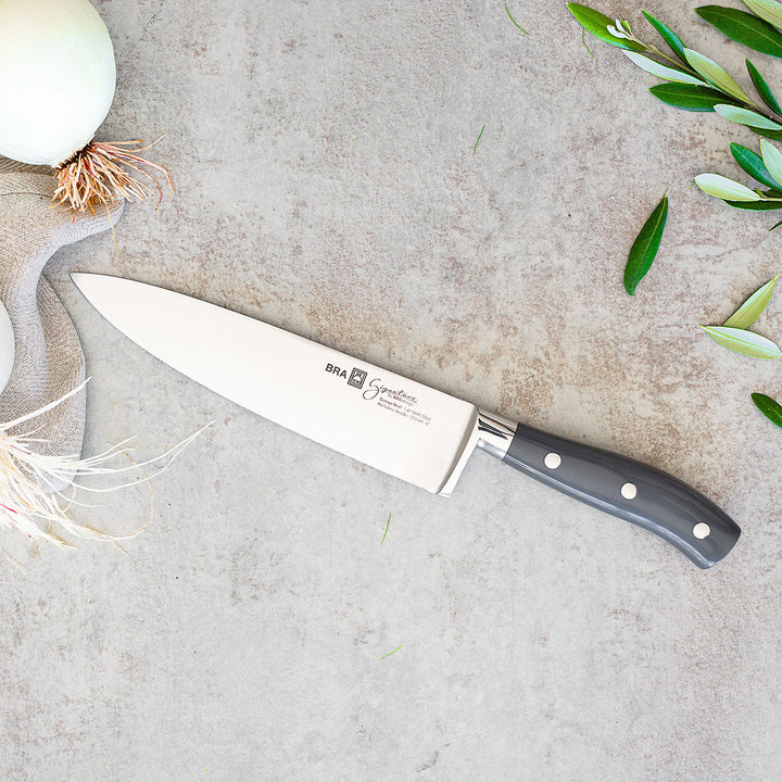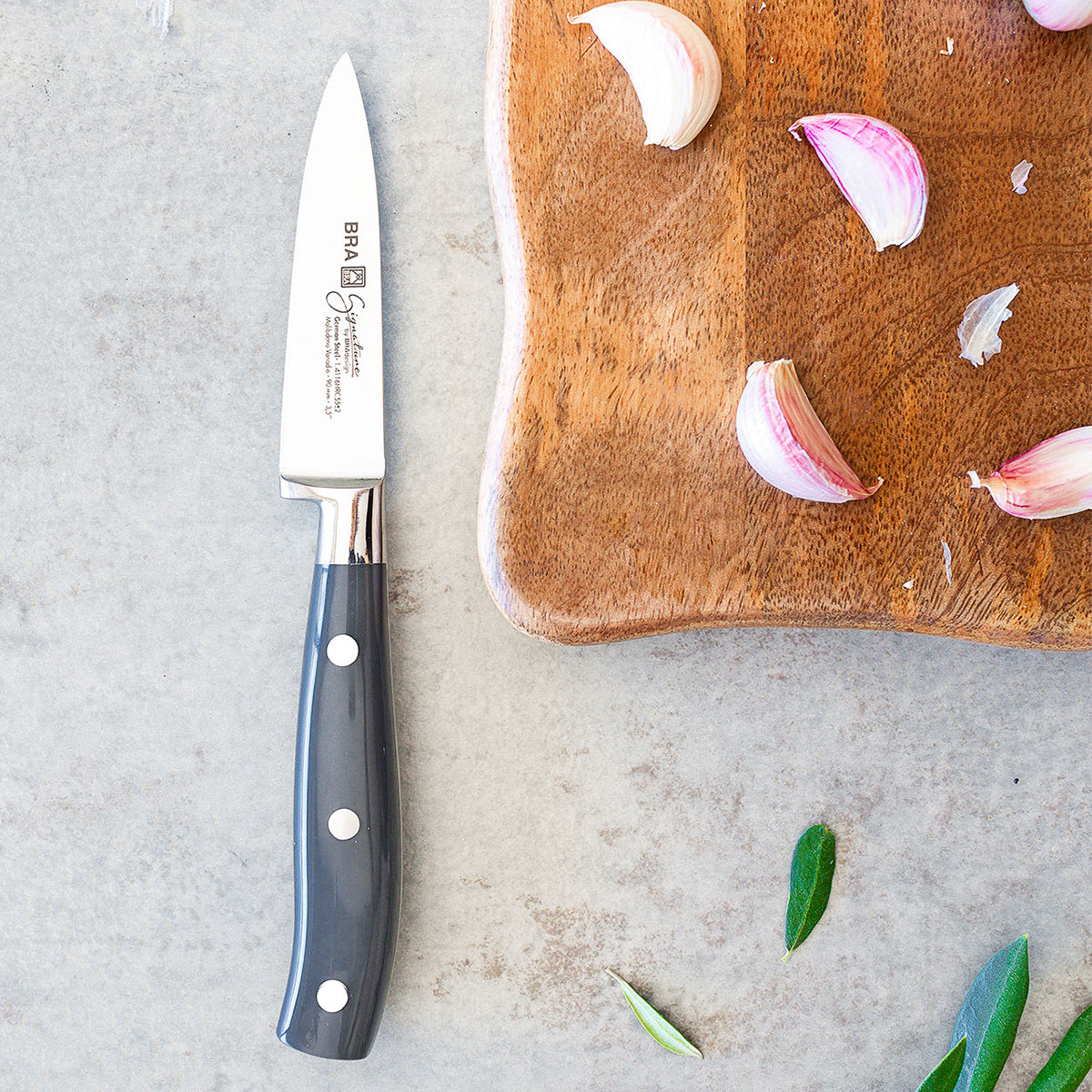 Juego de 3 Cuchillos BRA Signature diseñados para un uso diario con una gran calidad de corte, están fabricados en hoja de Acero Inoxidable Alemán 4116 Krupp Molibdeno Vanadio, de alta calidad, con una virola para la unión de la hoja y el mango, consiguiendo el equilibrado que permite un corte cómodo y seguro. Dureza Rockwell HRC55.