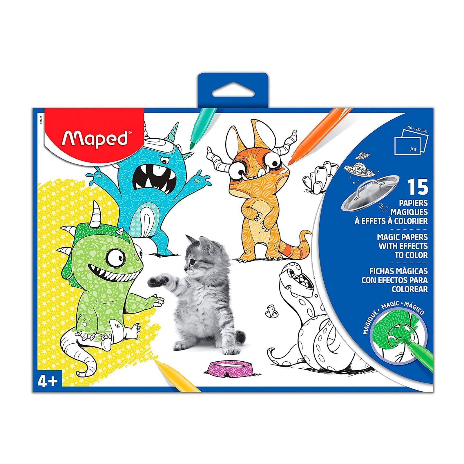 Set de 15 papeles para colorear con efectos mágicos MAPED perfectos para los más pequeños de la casa. Cada papel cuenta con una ilustración y son ideales para pintar con rotuladores.