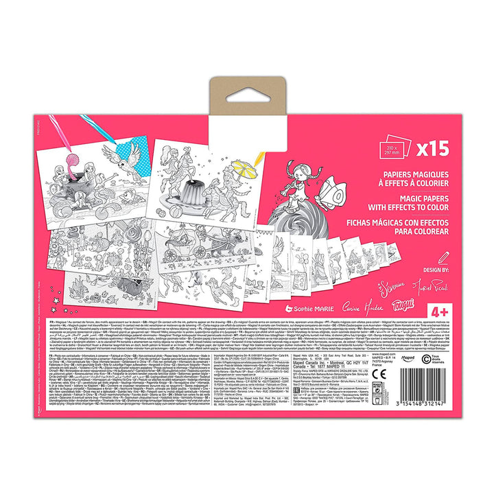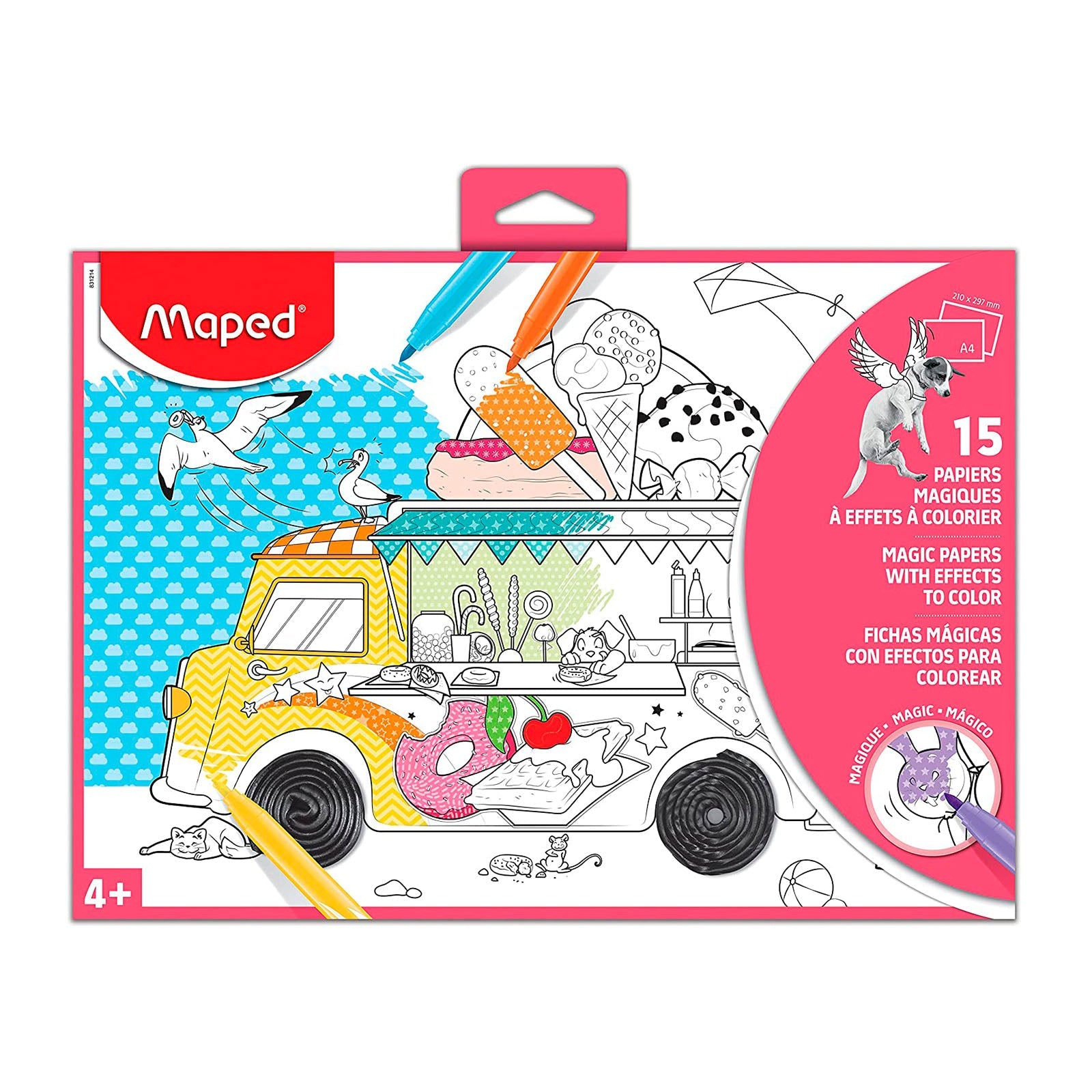 Set de 15 papeles para colorear con efectos mágicos MAPED perfectos para los más pequeños de la casa. Cada papel cuenta con una ilustración y son ideales para pintar con rotuladores.