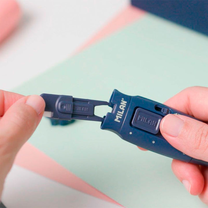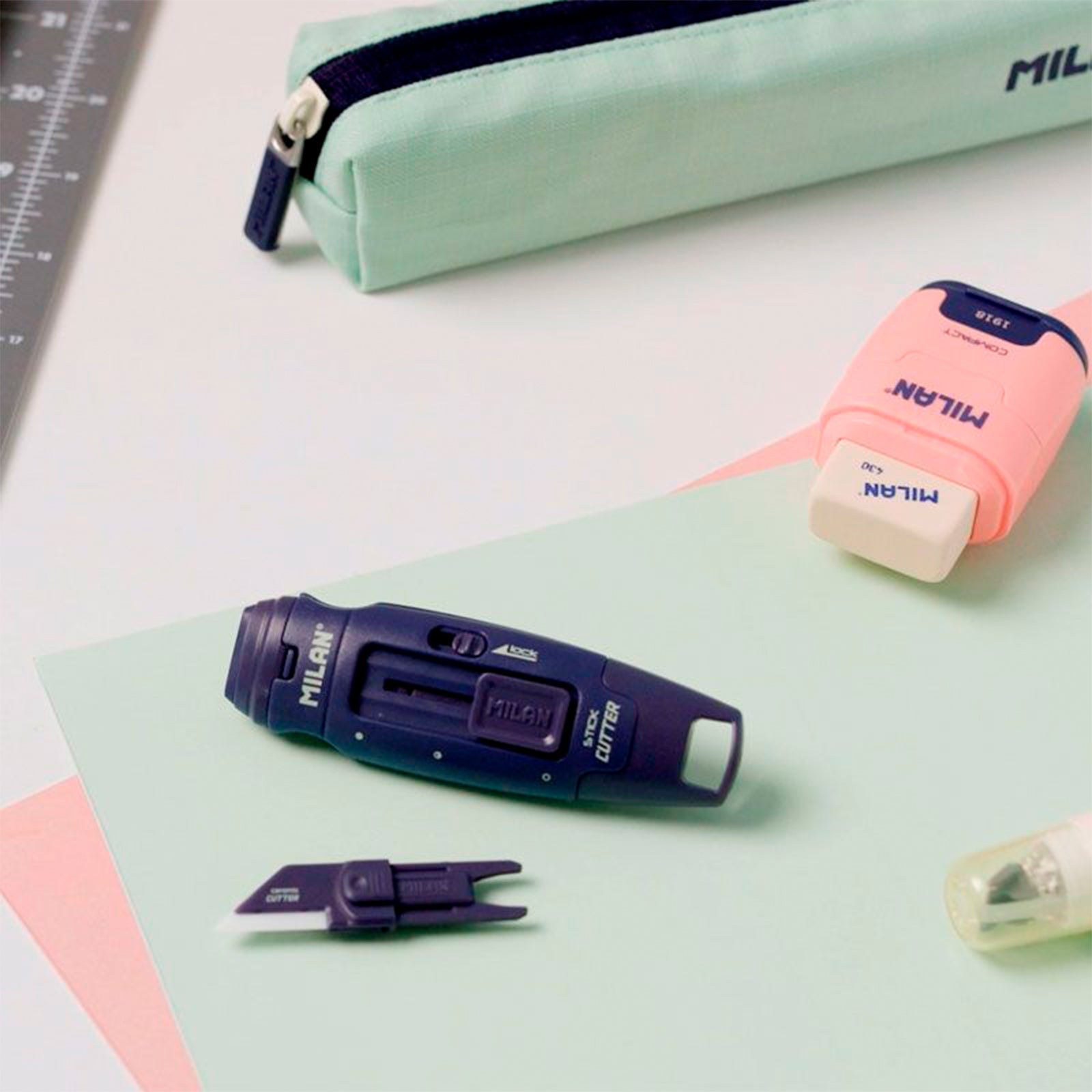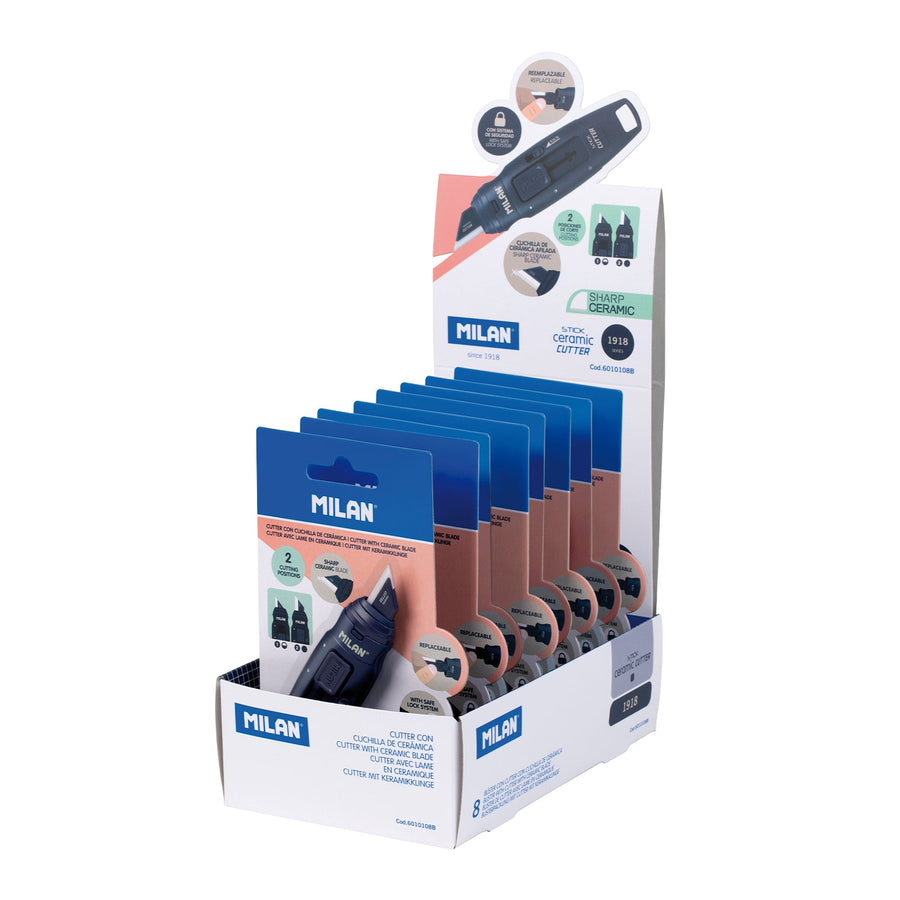 Caja con 8 Cúters con hoja de cerámica reemplazable. Diseño STICK, serie 1918 en color azul marino. Cuchilla con protector y sistema de bloqueo de seguridad. Botón deslizador con dos posiciones. De pequeño tamaño, tipo 'de bolsillo'. Con su forma ergonómica, es perfecto para manualidades o para abrir paquetes. La hoja cerámica corta distintos tipos de material. Dispone de un ojal para poder ser colgado. Hojas cerámicas de recambio disponibles.