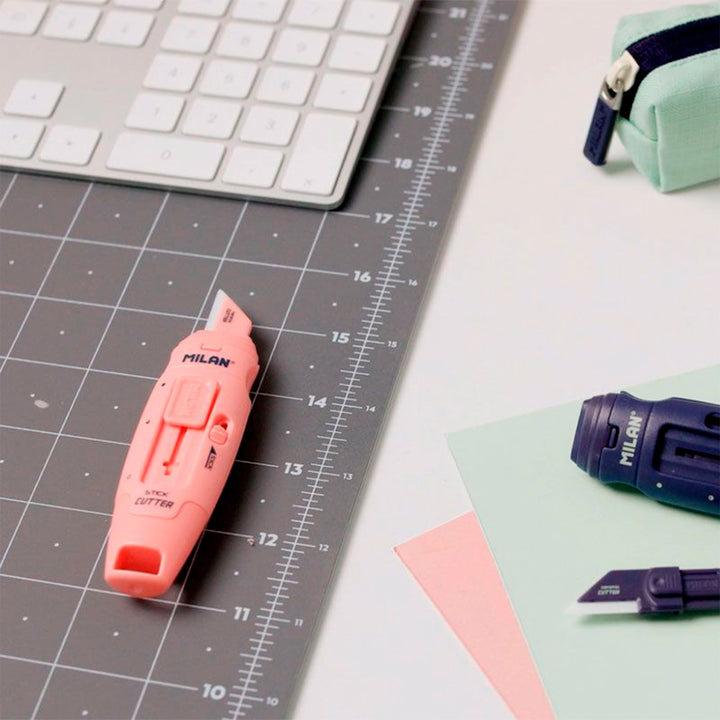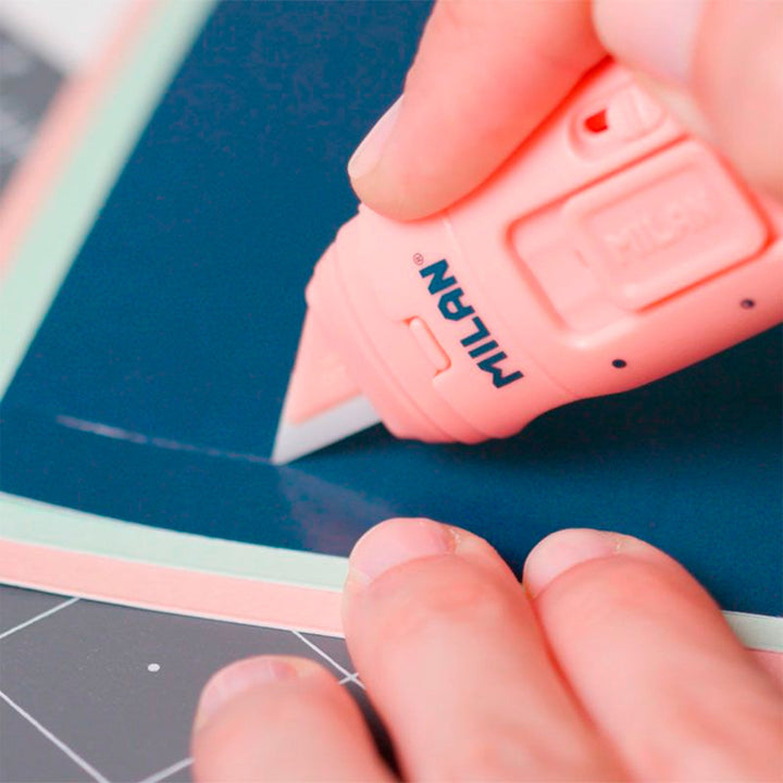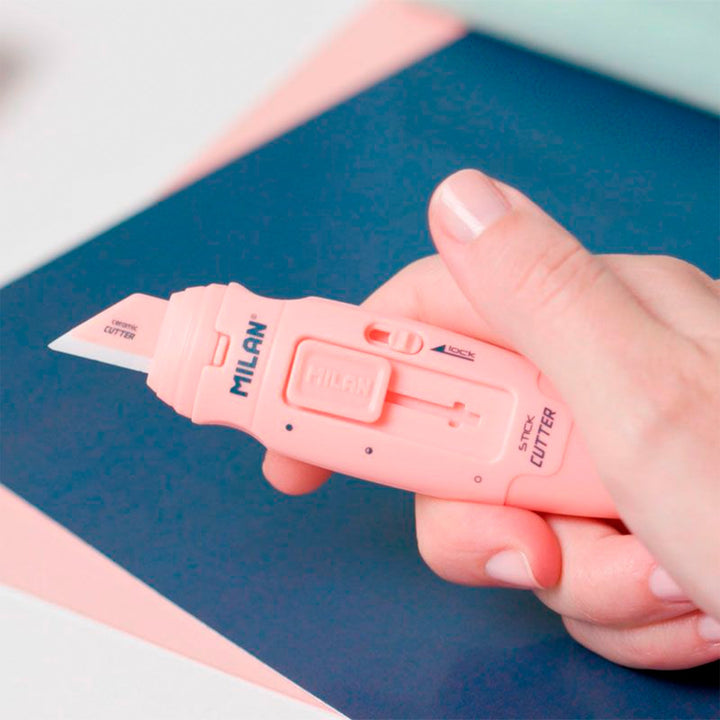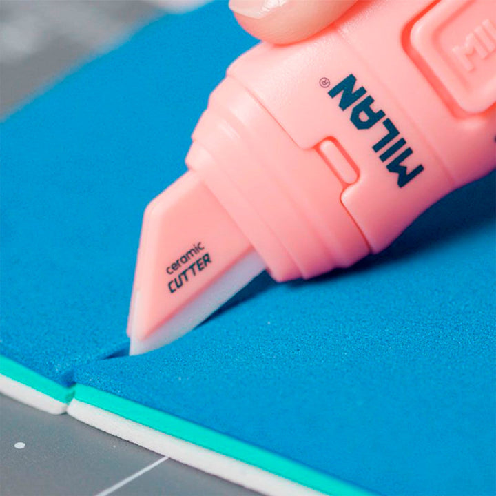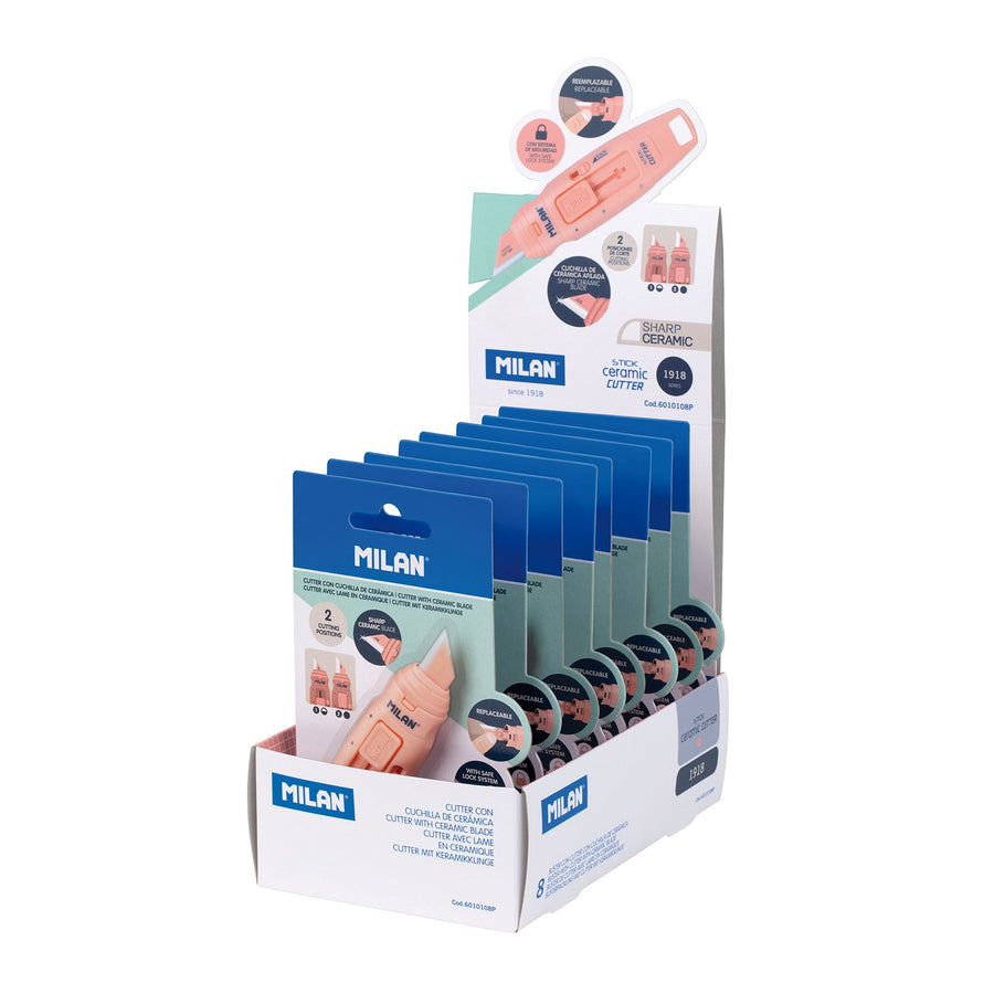 Caja con 8 blisters de Cúters con hoja de cerámica reemplazable. Diseño STICK, serie 1918 en color rosa. Cuchilla con protector y sistema de bloqueo de seguridad. Botón deslizador con dos posiciones. De pequeño tamaño, tipo 'de bolsillo'. Con su forma ergonómica, es perfecto para manualidades o para abrir paquetes. La hoja cerámica corta distintos tipos de material. Dispone de un ojal para poder ser colgado. Hojas cerámicas de recambio disponibles.