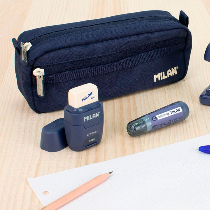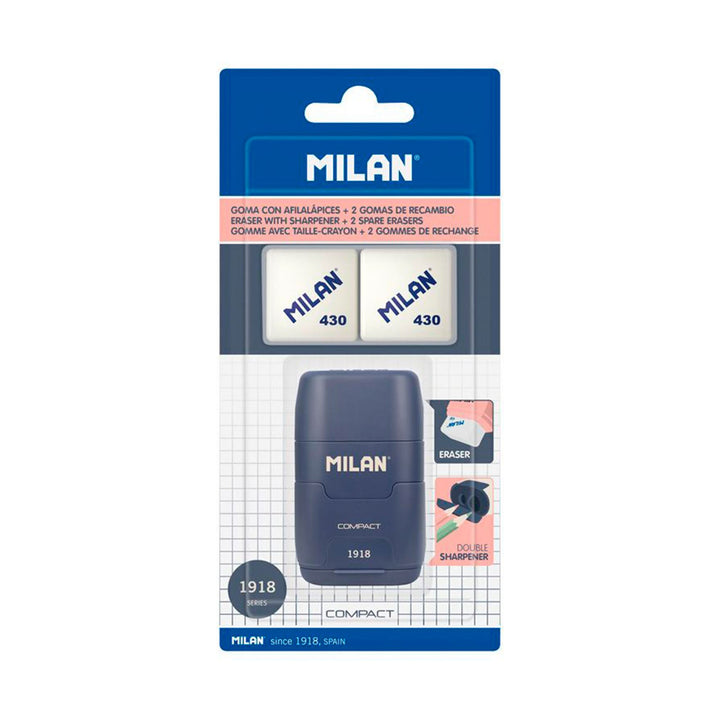 Afilaborra MILAN COMPACT serie 1918, una combinación de goma de borrar y sacapuntas doble (uno estándar y otro MAXI) con depósito. Incluye dos gomas de borrar 430 de recambio, ¡para que no te quedes sin!