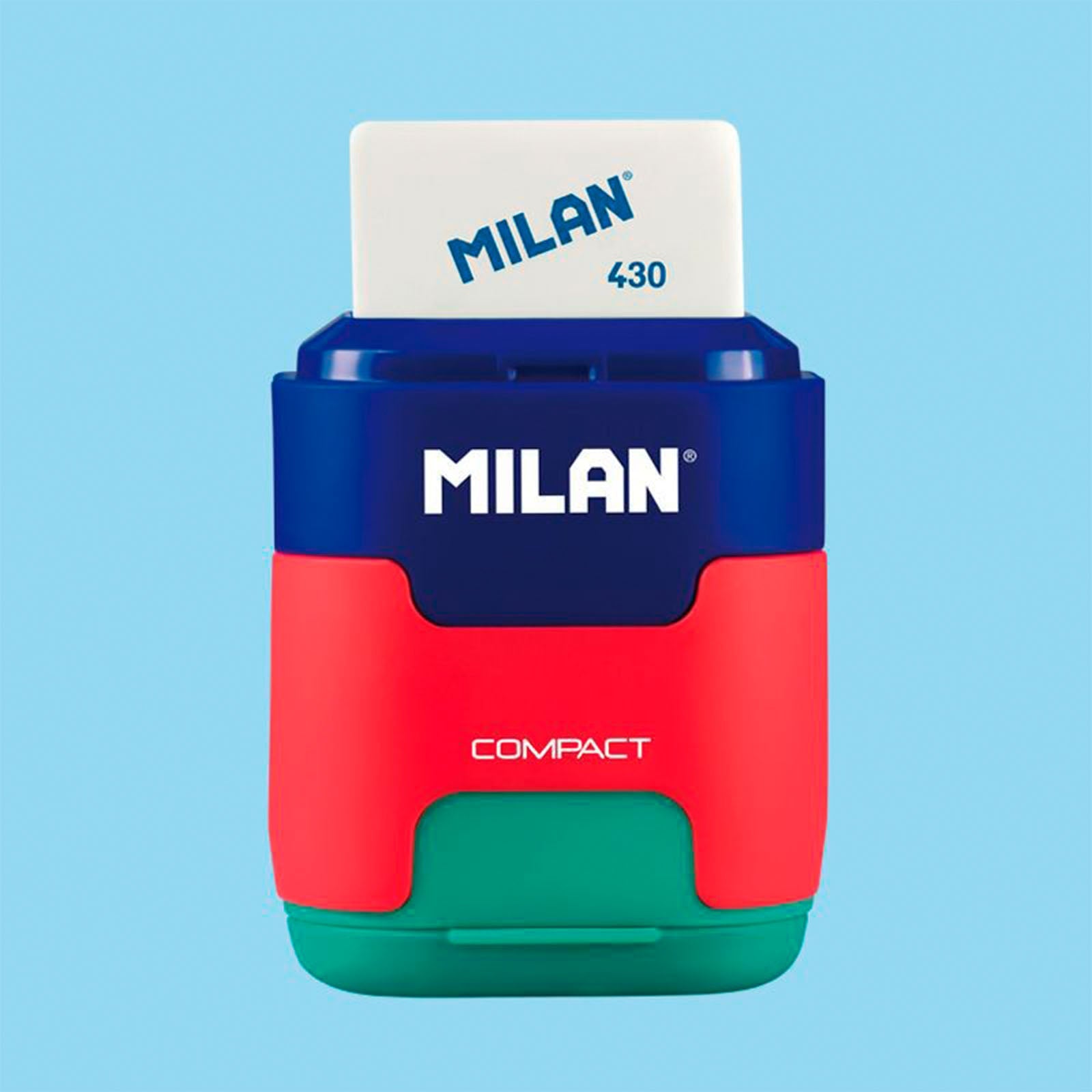 Caja expositora 24 afilaborras Milan Compact Mix. Combinación de goma y sacapuntas doble (uno estándar y otro MAXI). Goma cuadrada suave de caucho sintético tipo "miga de pan". El sacapuntas tiene una cuchilla de acero al carbono afilada y resistente, ideal para todo tipo de lápices. Artículo con cuchilla de seguridad. Este sistema evita que se pueda separar la hoja del cuerpo del sacapuntas, siendo óptimo para uso escolar y para llevar en el estuche. Diseñado en España por el propio departamento de I+D de MILAN. Colores surtidos disponibles: rojo, verde, amarillo y azul.