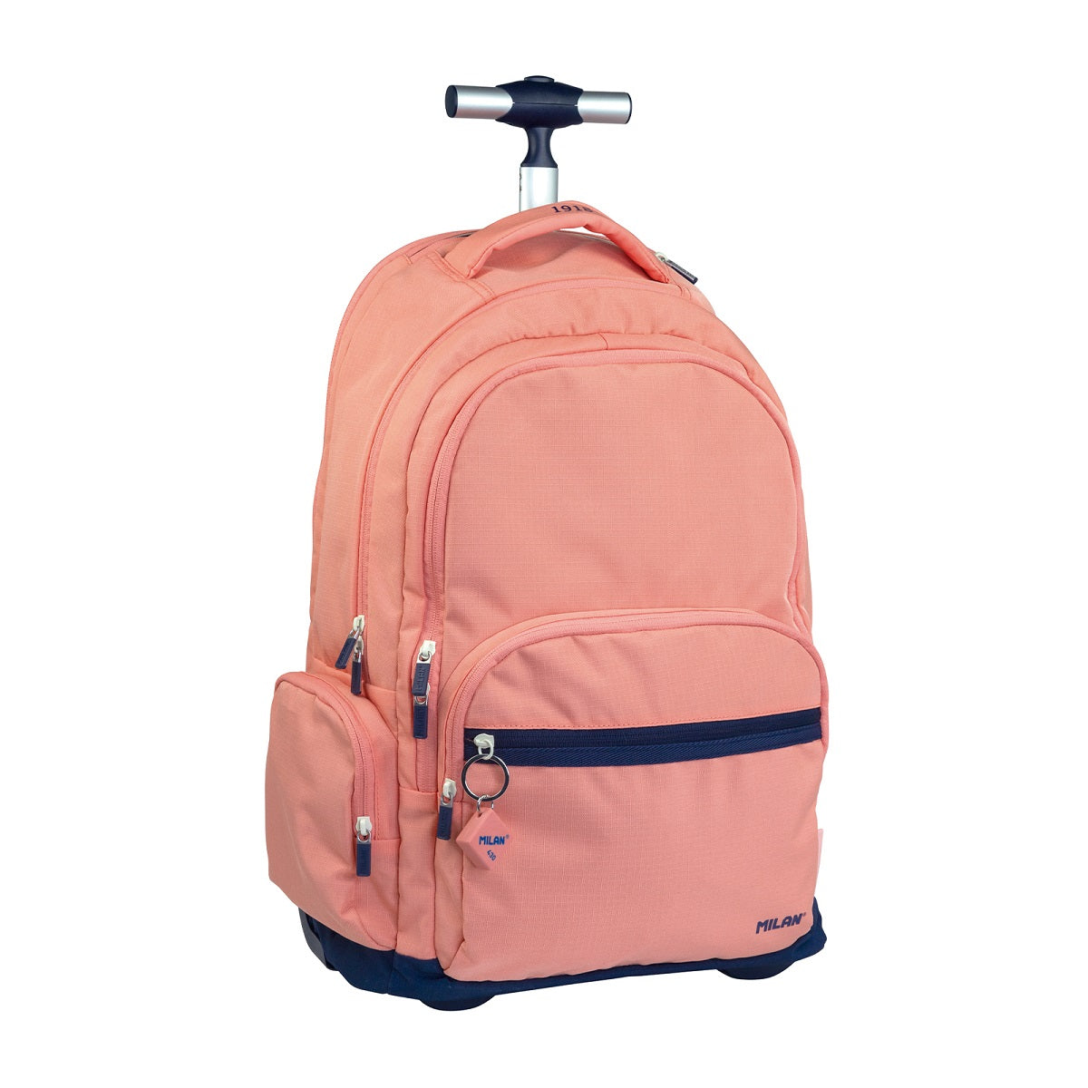 Mochila escolar con ruedas MILAN con sistema de carro ligero integrado y mango metálico retráctil. Serie 1918, color rosa con detalles azul marino. Inspirada en los colores y diseño originales de las gomas de borrar Milan. Mochila con 6 cremalleras. Bolsillo principal con compartimento interior protector para portátil. 3 bolsillos delanteros, uno de ellos con organizador y llavero extraíble. 2 bolsillos laterales de fácil acceso (uno de malla y otro con cremallera). El bolsillo delantero incluye un llavero de la goma 430 en el tirador de la cremallera.
