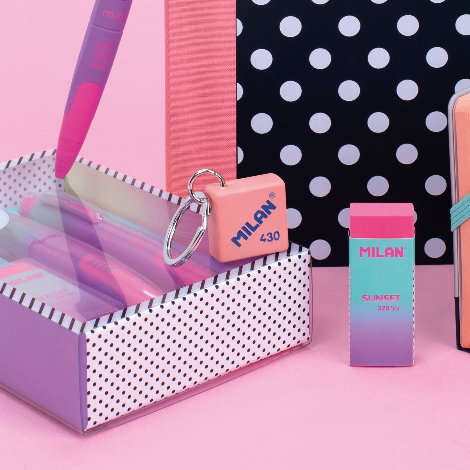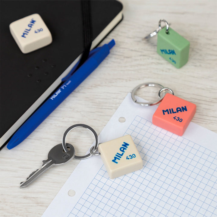 Juego de 2 Llaveros con la forma y diseño de la icónica goma de borrar MILAN 430 fabricada en 1918, un detalle original que no dejará indeferente a nadie. Todo un simbolo respetando la tradición de mas 100 años y los colores originales.