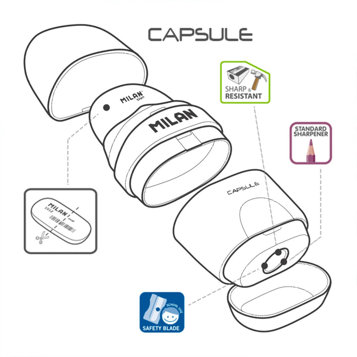 Combinación de goma y sacapuntas estándar con depósito. Goma ovalada suave de caucho sintético tipo 'miga de pan'. El sacapuntas tiene una cuchilla de acero al carbono afilada y resistente, ideal para todo tipo de lápices. Artículo con cuchilla de seguridad. Este sistema evita que se pueda separar la hoja del cuerpo del sacapuntas, siendo óptimo para uso escolar y para llevar en el estuche. Diseñado en España por el propio departamento de I+D de MILAN. Colores surtidos disponibles: azul, amarillo y rosa