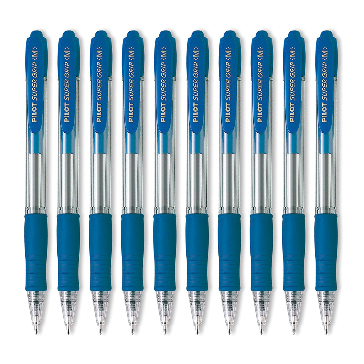 Caja de 10 bolígrafos retráctiles PILOT Super Grip con cuerpo de plástico transparente que permite ver el nivel de la tinta. Grip con sujeción de caucho en la parte inferior que reduce la fatiga al escribir y hace más cómodo el agarre.