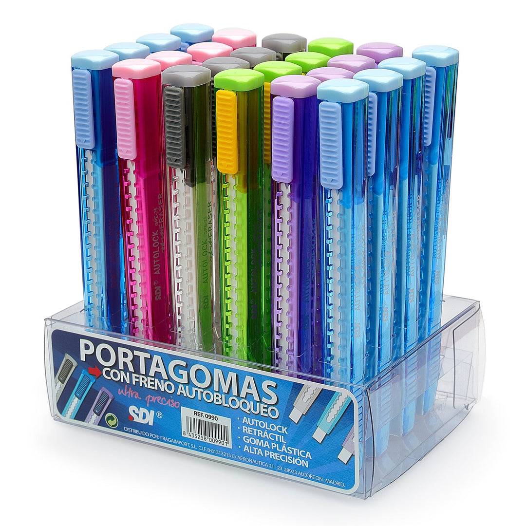 Portagomas con freno auto bloqueo que permite un uso práctico y preciso, con un sistema retráctil tipo bolígrafo que permite proteger la goma cuando no se esté usando. Disponible en 5 colores diferentes. Referencia: 0990