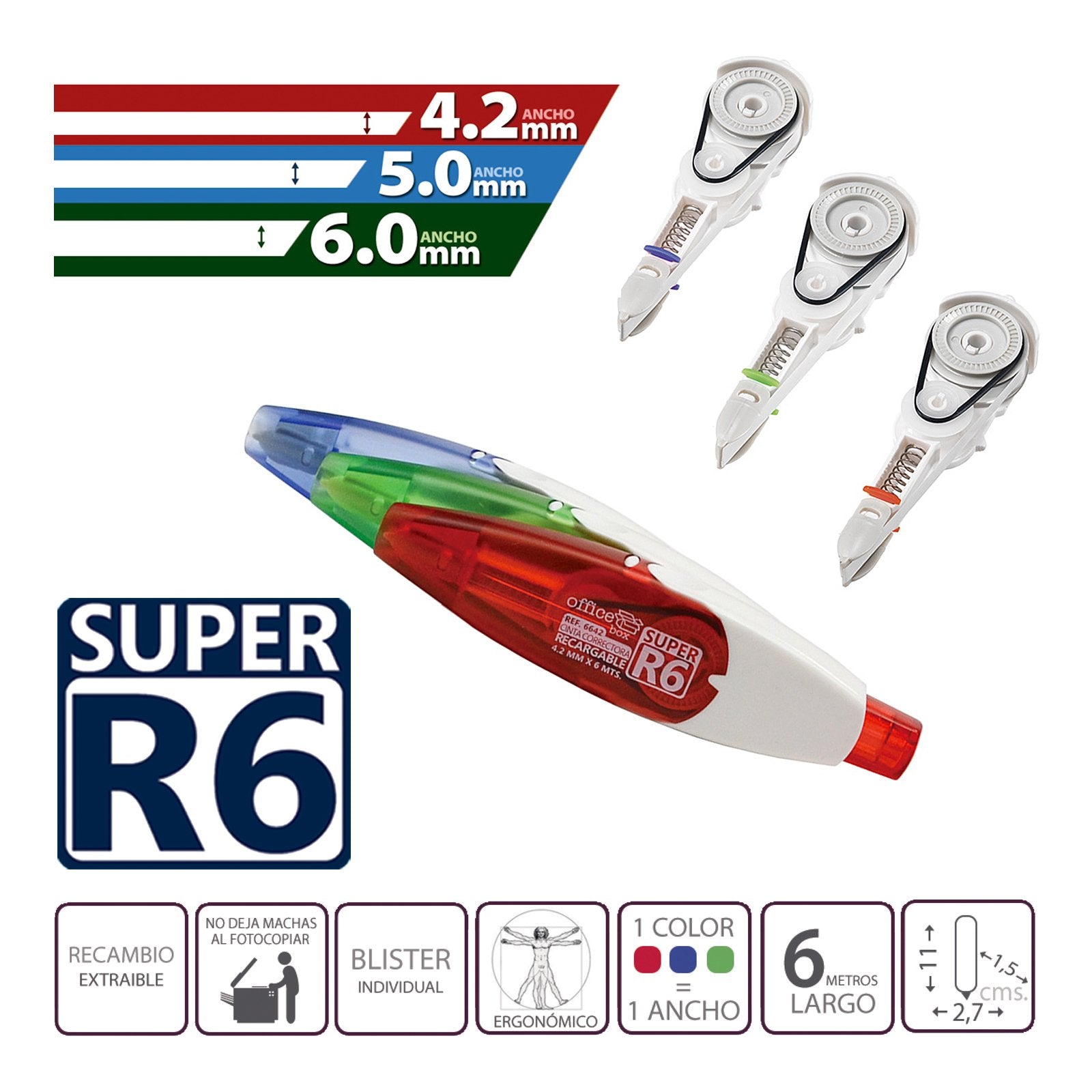 Pack de 2 cintas correctoras SDI Super R6 de 5 mm de ancho. Tienen un diseño ergonómico y cuentan con un pulsador para poder esconder en extremo evitando así que se estropee la cinta cuando no se está usando.