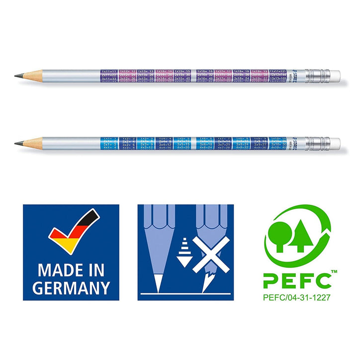Lápices ecológicos, con madera con certificación PEFC, procedente de bosques de gestión sostenible. Dos grabados especiales sobre fondo plateado: tablas de multiplicar hasta 10 (azul claro y azul), tablas de multiplicar desde 10 (rosa y violeta).