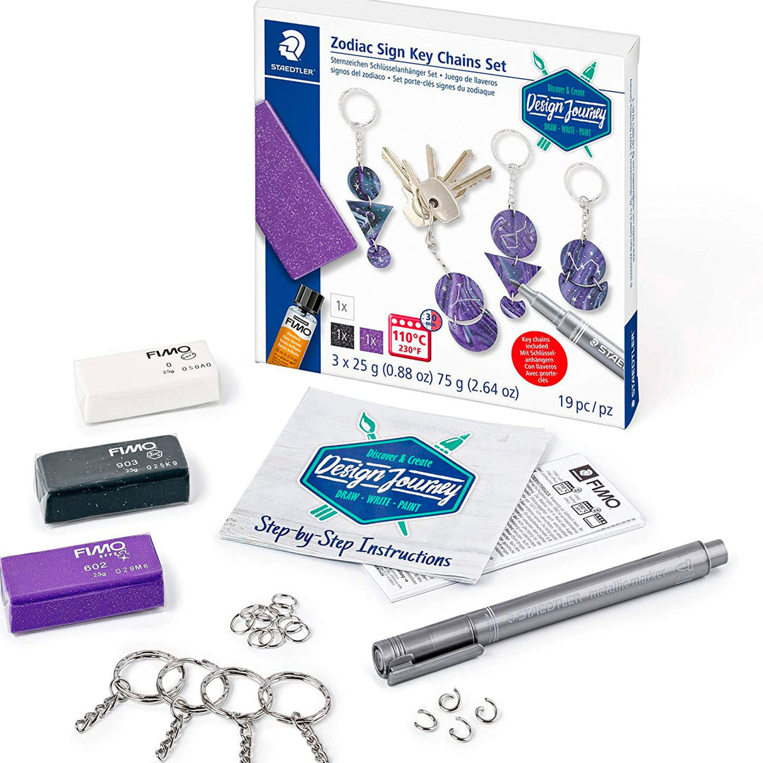 El set de manualidades creativo Zodiac Sign Key Chains de la serie Design Journey de STAEDTLER contiene una gran variedad de productos de alta calidad para crear llaveros de FIMO, que podrás decorar posteriormente con estrellas y signos del zodiaco personalizados. Referencia: 61 DJT2
