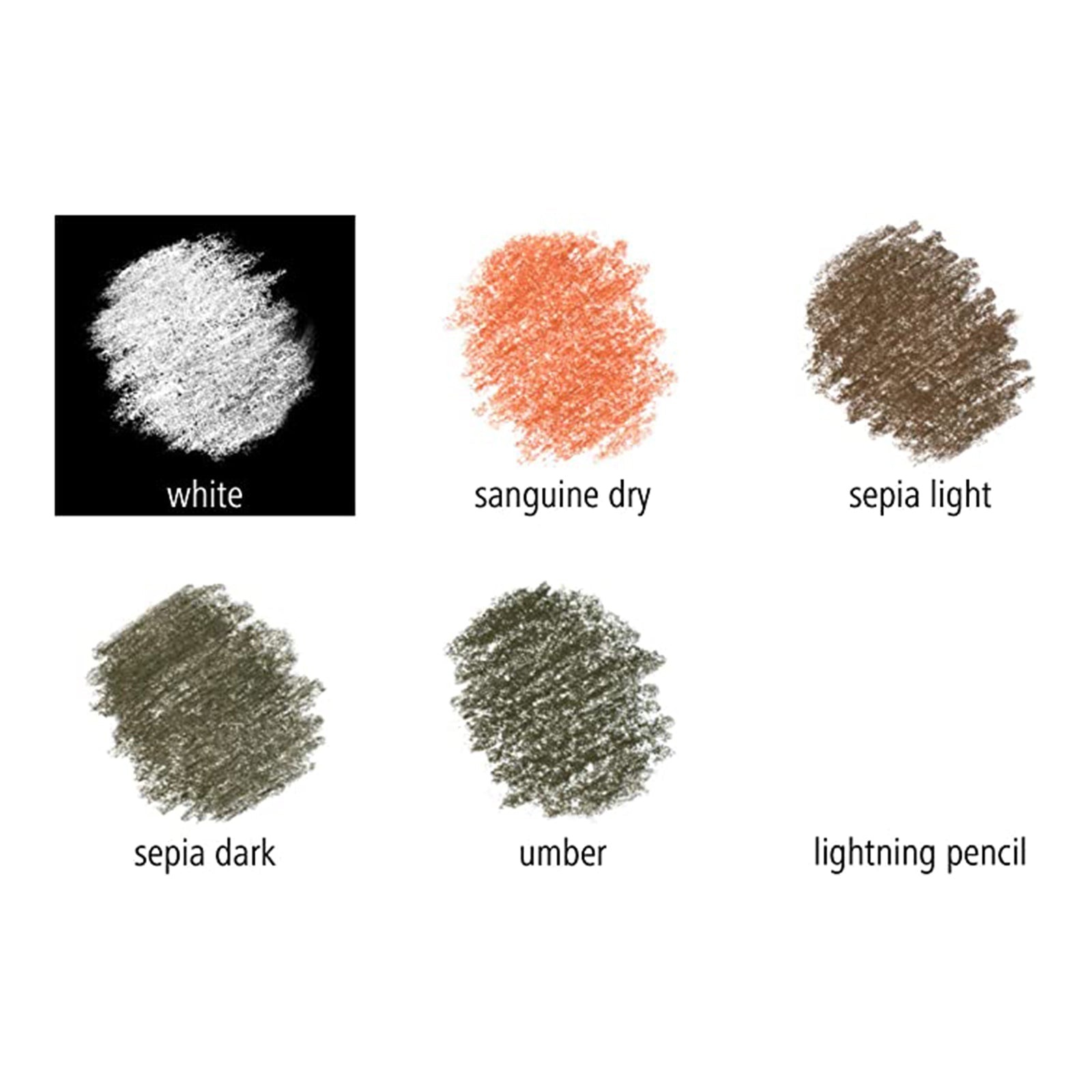 Cuentan con una formulación particularmente pigmentada para los detalles en tus creaciones. Colores que incluye: sepia claro, sepia oscuro, ocre oscuro, sanguina seca, blanco, iluminador. Están fabricados con madera con certificación PEFC, procedentes de bosques de gestión sostenible, por lo que son ecológicos.